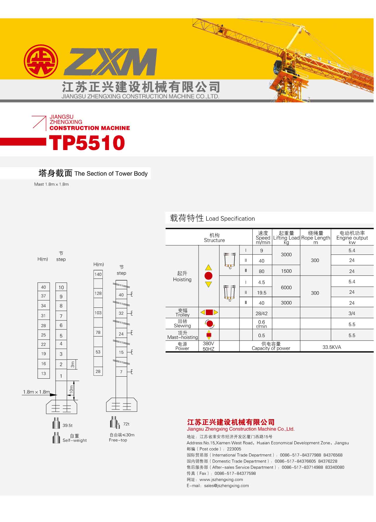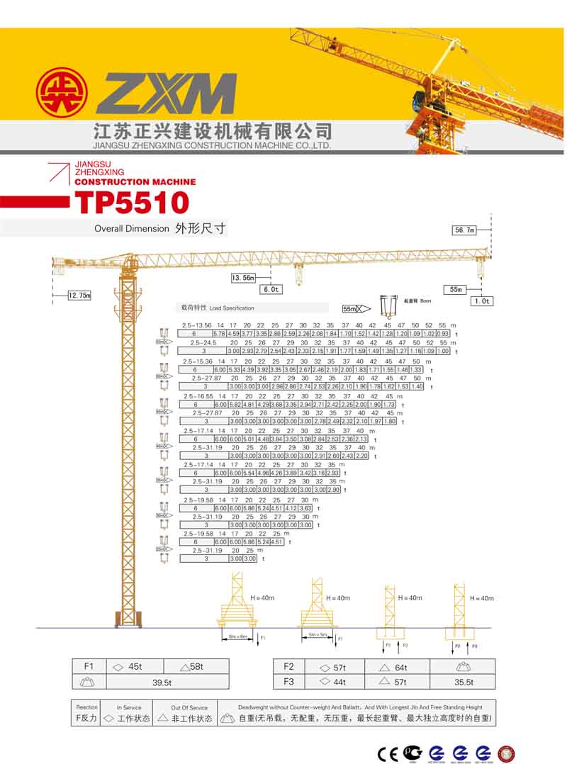 2、最大工作幅度55米,最大起重量6噸,額定起重力矩630KN.M;